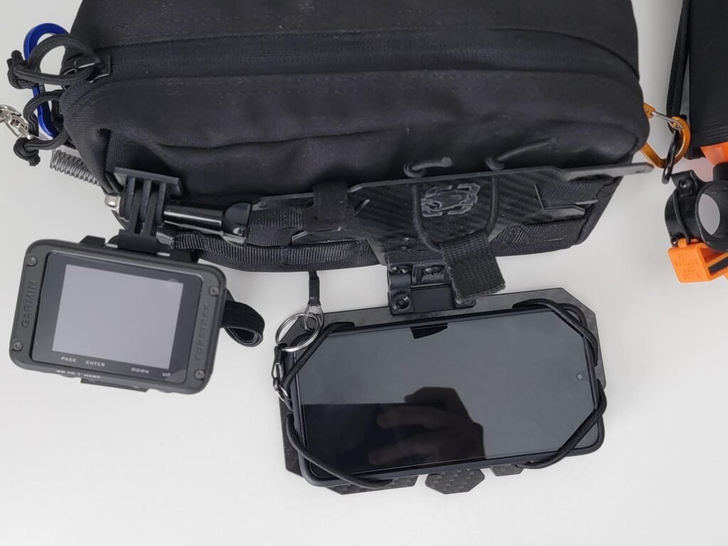 When I’m running a chest rig, plate carrier, or doing a long hike with a pack, I use a rugged MOLLE-compatible phone holder. It keeps the phone high, visible, and protected while still letting me use it one-handed for quick maps, comms checks, or scanning frequencies.